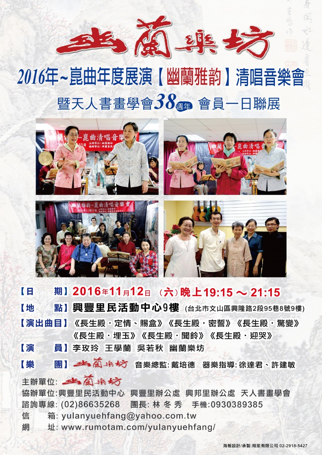 2016年崑曲年度展演「幽蘭雅韵」清唱音樂會暨天人書畫學會38週年會員一日聯展 article reports and propaganda posters 文章報導和宣傳海報 01 十一月 2016 點擊數: 938 Email 日期:2016.11.12(六)PM7:15~PM9:15地點:興豐里民活動中心9F (台北市文山區興隆路2段95巷8號9樓) 上一篇 下一篇 tweet