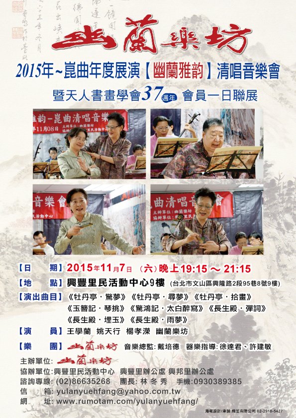 最新動態 2015年崑曲年度展演「幽蘭雅韵」清唱演唱會暨天人書畫學會37周年會員一日聯展 events 演出 02 十一月 2015 點擊數: 1085 Email 演唱日期:2015.11.7(六)PM19:15~PM21:15 地點:興豐里民活動中心9樓(台北市文山區興隆路2段95巷8號9樓) 上一篇 下一篇 tweet