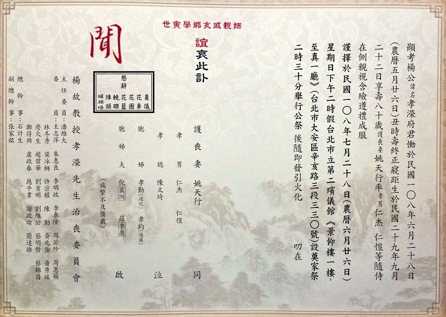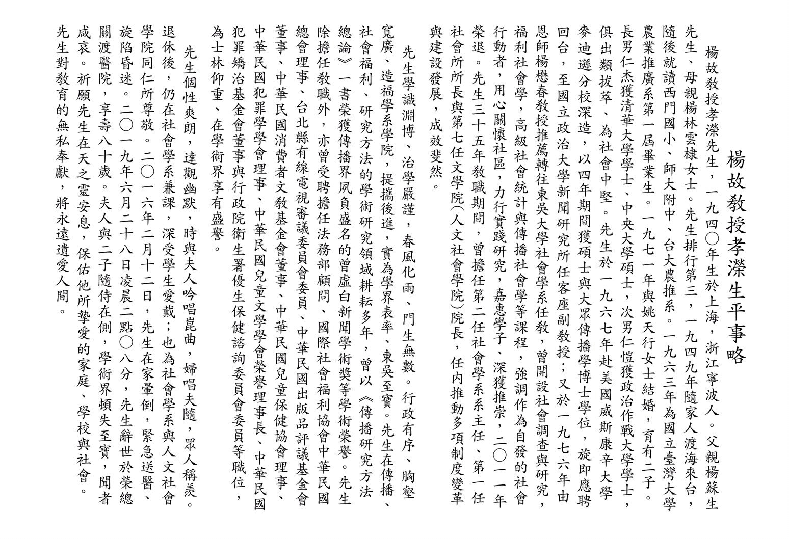 楊故教授孝濚先生,一九四0年生於上海,浙江寧波人。父親楊蘇生先生、母親楊林雲棣女士。先生排行第三,一九四九年隨家人渡海來台,隨後就讀西門國小、師大附中、台大農推系。一九六三年為國立臺灣大學農業推廣系第一屆畢業生。一九七一年與姚天行女士結婚,育有二子。長男仁杰獲清華大學學士、中央大學碩士,次男仁愷獲政治作戰大學學士,俱出類拔萃、為社會中堅。先生於一九六七年赴美國威斯康辛大學麥迪遜分校深造,以四年期間獲碩士與大眾傳播學博士學位,旋即應聘回台,至國立政治大學新聞研究所任客座副教授;又於一九七六年由恩師楊懋春教授推薦轉往東吳大學社會學系任教,曾開設社會調查與研究,福利社會學,高級社會統計與傳播社會學等課程,強調作為自發的社會行動者,用心關懷社區,力行實踐研究,嘉惠學子、深獲推崇,二0一一年榮退。先生三十五年教職期間,曾擔任第二任社會學系系主任、第一任社會所所長與第七任文學院(人文社會學院)院長,任內推動多項制度變革與建設發展,成效斐然。